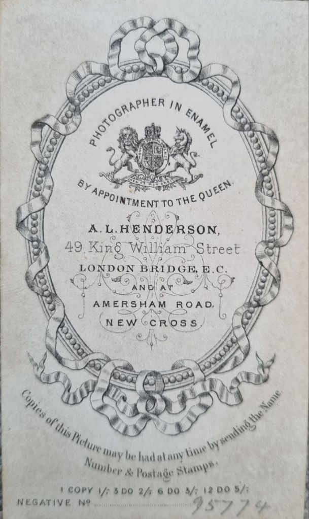 As revealed by this carte-de-visite verso, ‘A.L. Henderson’ operated studios at two locations in London endorsed by his impeccable royal credentials.