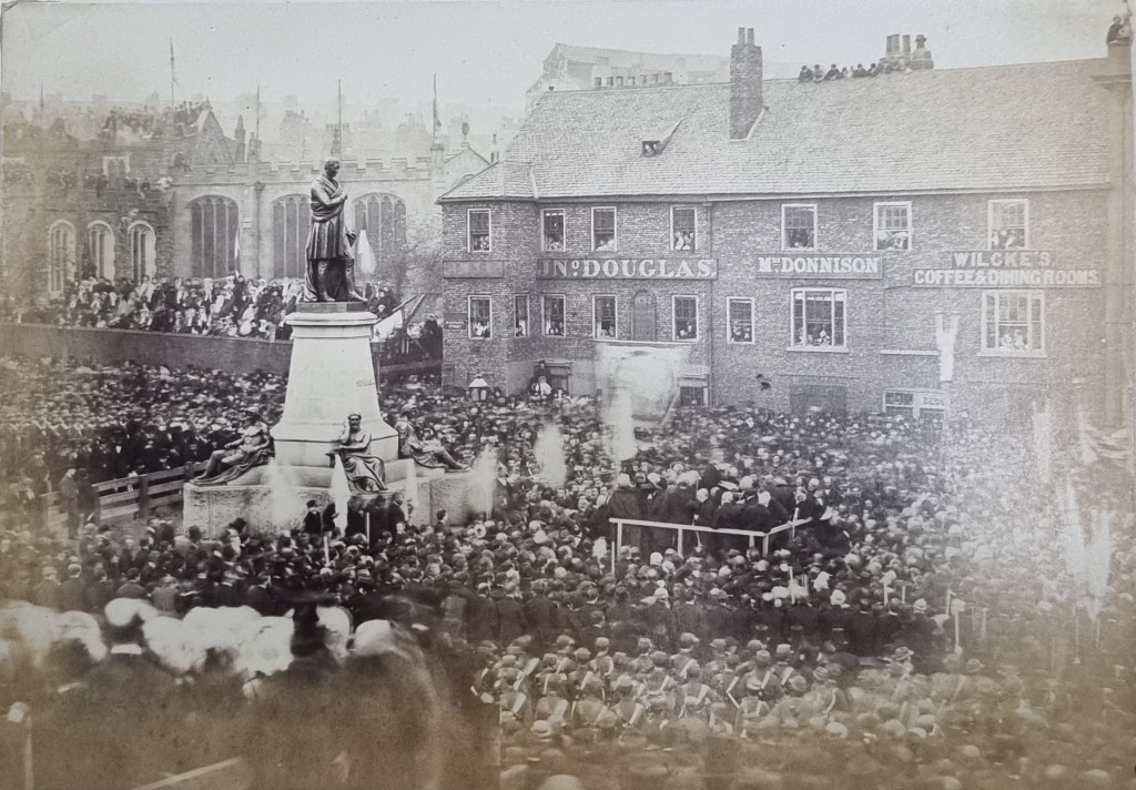 At the base of the statue, the Newcastle Daily Journal identified three of the city’s photography firms together with their equipment, observing “Messrs. Downey, Warren and Laws – pursuing their peaceful and interesting vocation.”