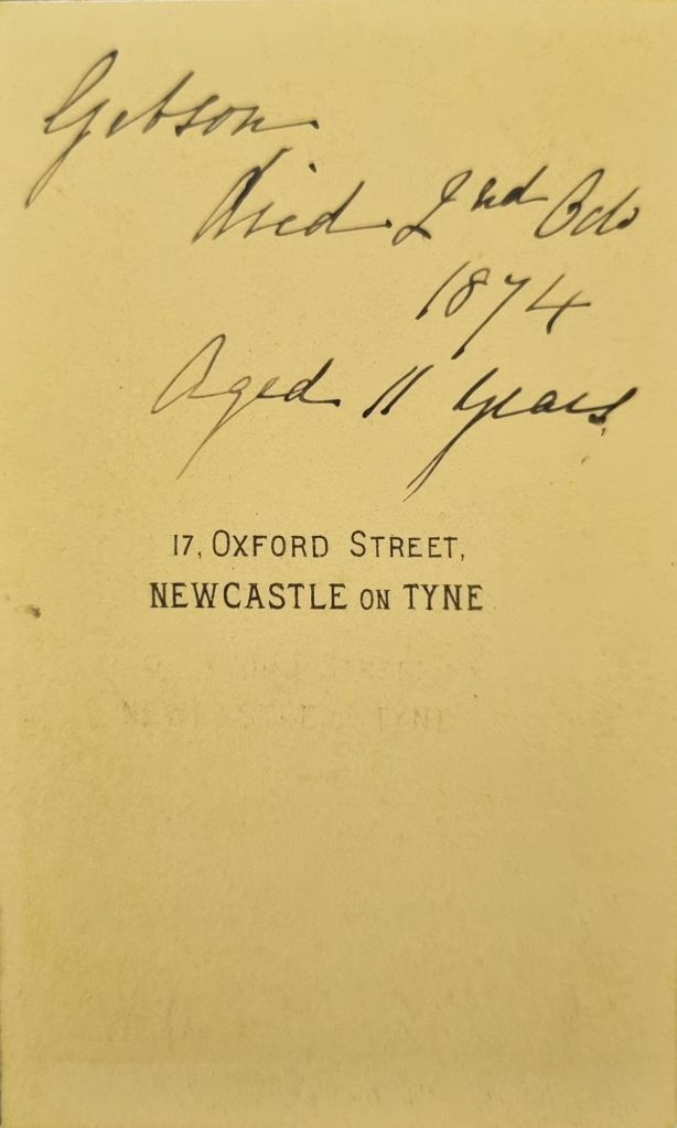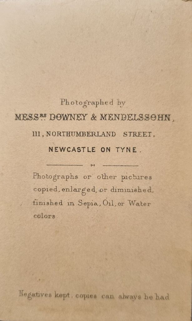 Whilst there is no photographer’s stamp or credit, the verso does feature a slightly-faded sticker for “Allan” whose Newcastle business sold stereocards and carte-de-visites during this period.