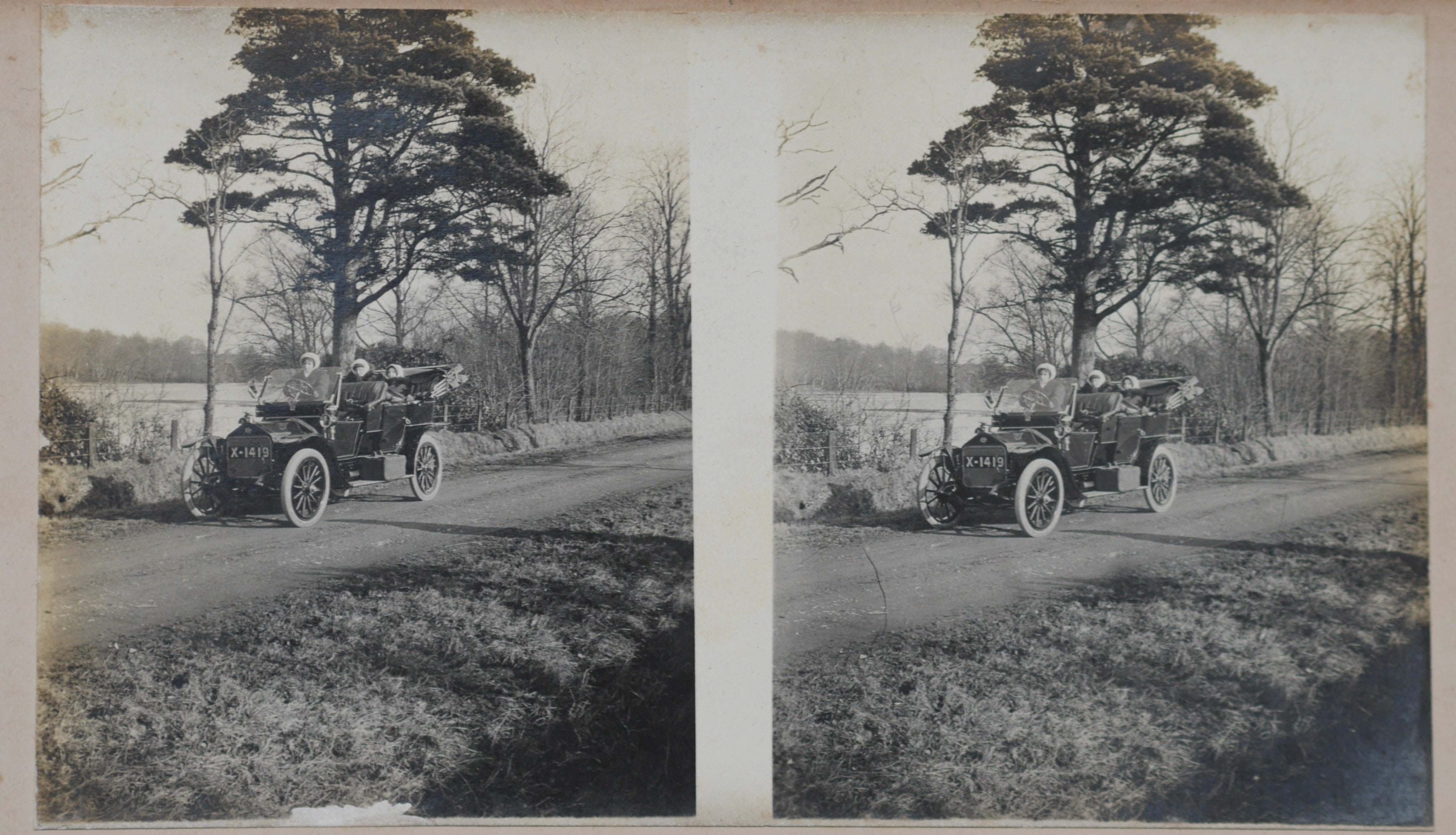 Exploring connections to the ‘Miss Hamilton driving’ stereo, the bonnet-wearing younger girl in the centre of shot resembles the passenger in the right-hand rear passenger’s seat of ‘X 1419.’