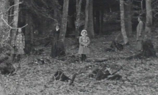 In a wooded glade, the camera was positioned so that various tree trunks featured in the immediate foreground of the shot, producing a heightened three-dimensional effect.
