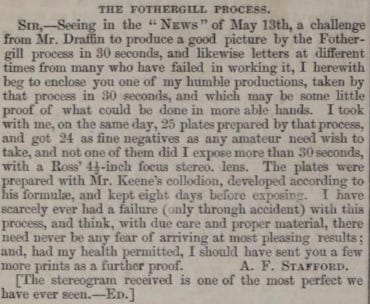 In a contribution to the paper’s ‘Photographic Notes and Queries’ column (5th August 1859), Stafford described his experience of using the newly-announced dry plate Fothergill Process.