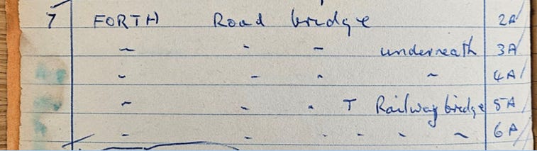 The shot list records a sequence featuring the Forth Road Bridge (1958-1964) and culminating in a shot that also features the railway bridge (1890) in the far distance.