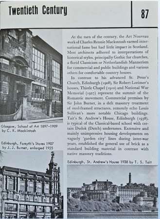 Such is the richness of Scotland’s architecture that comparatively few pages in the Oriel Guide are given over to recent buildings photographed by Ursula such as the Glasgow School of Art (1897-1909, top left) and St. Andrew’s House, Edinburgh (1938, bottom right).