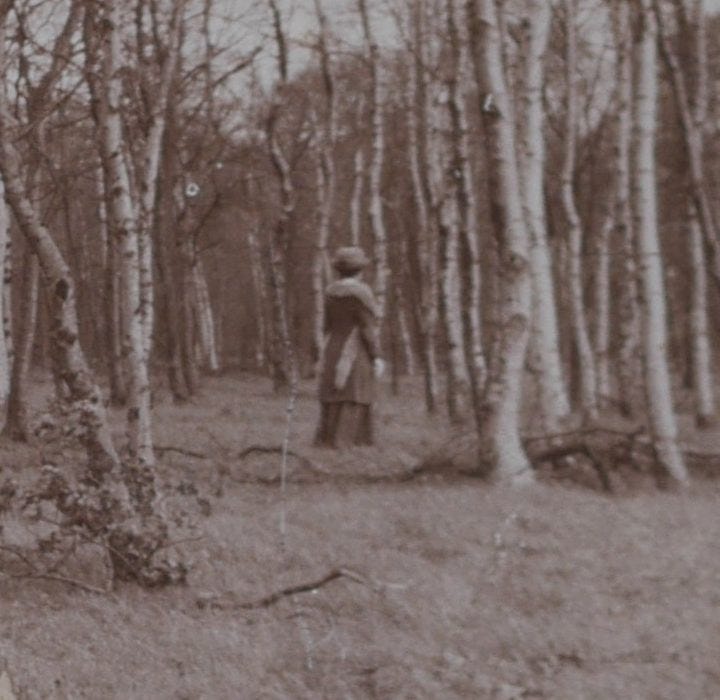 This time, a single female figure with their back to the camera can be observed in the centre of shot, dressed in a three-quarter length coat and hat with fur stole.