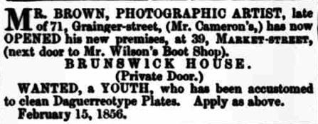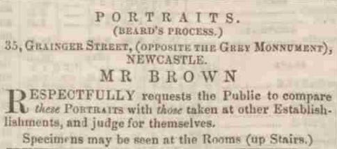 The man responsible for the Portrait Rooms was a daguerreotypist named George Brown whose adverts appeared regularly in the Newcastle press from 1849 and during the first half of the 1850s.